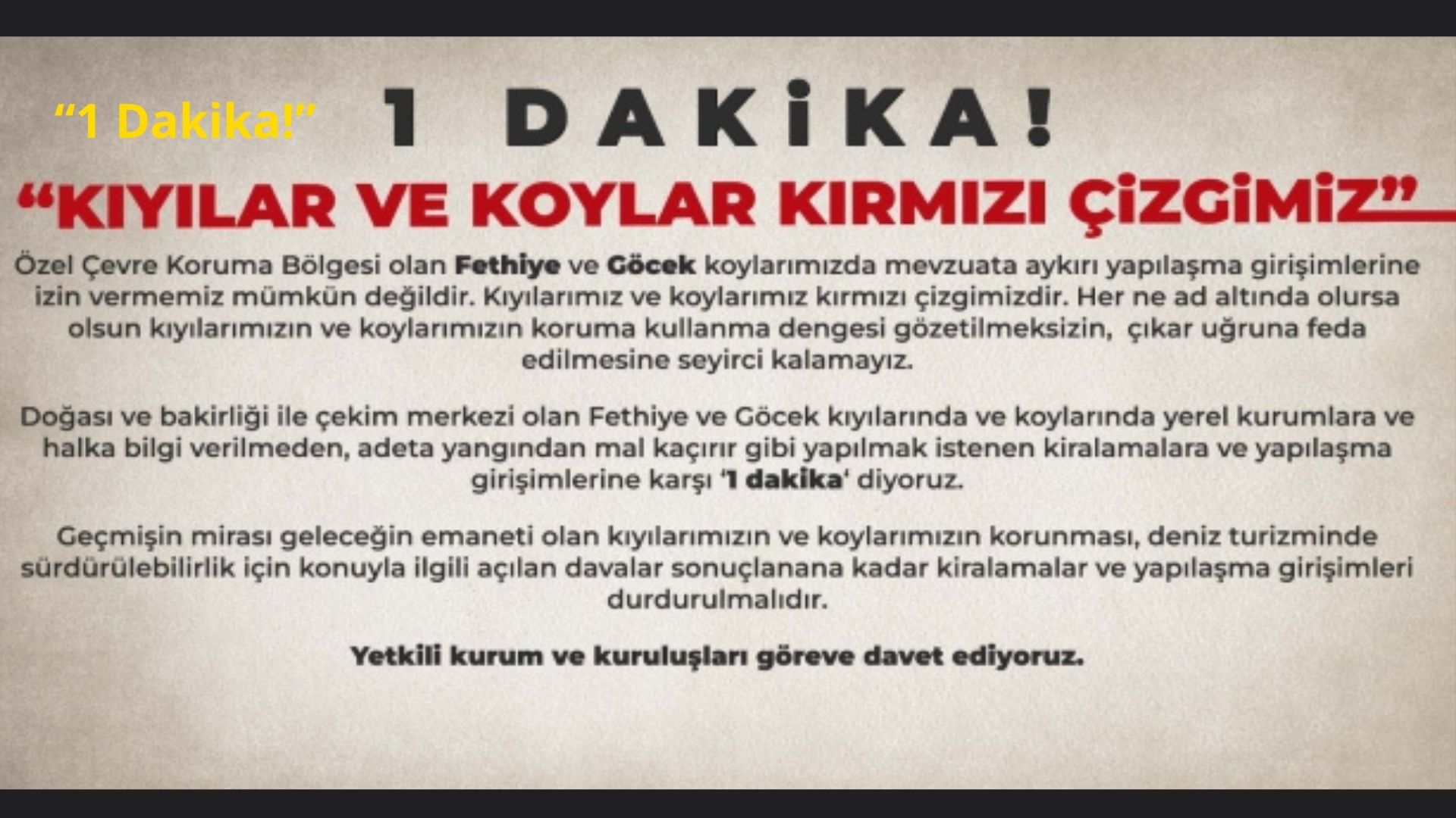 Kıyılarımız ve koylarımız kırmızı çizgimizdir. Her ne ad altında olursa olsun kıyılarımızın ve koylarımızın koruma kullanma dengesi gözetilmeksizin, çıkar uğruna feda edilmesine seyirci kalamayız. Doğası ve bakirliği ile çekim merkezi olan Fethiye ve Göcek kıyılarında ve koylarında yerel kurumlara ve halka bilgi verilmeden, adeta yangından mal kaçırır gibi yapılmak istenen kiralamalara ve yapılaşma girişimlerine karşı ‘1 dakika‘ diyoruz. Geçmişin mirası geleceğin emaneti olan kıyılarımızın ve koylarımızın korunması, deniz turizminde sürdürülebilirlik için konuyla ilgili açılan davalar sonuçlanana kadar kiralamalar ve yapılaşma girişimleri durdurulmalıdır. Yetkili tüm kurum ve kuruluşları göreve davet ediyoruz.” denildi.