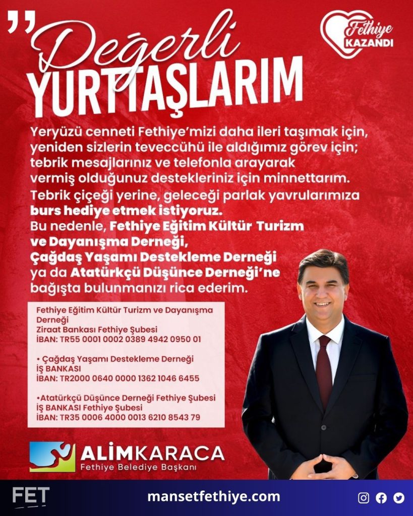 Fethiye Belediye Başkanı Alim Karaca, sosyal medya hesabından yaptığı duyuruda, “Tebrik çiçeği yerine, geleceği parlak yavrularımıza burs hediye etmek istiyoruz.” dedi