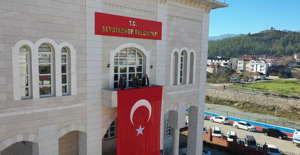 Seydikemer Belediye Başkanı B. Önder Akdenizli, Belediye Hizmet Binasına Türk bayrağı asarak ev ve iş yerlerinin bayraklarla donatılması için çağrı yaptı.