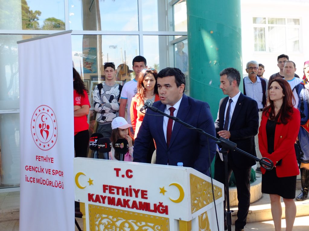 Daha sonra katılımcılar bayram programı için Fethiye Belediyesi Özer Olgun Kültür Merkezi açık hava gösteri alanına geçti. Açılış konuşmasını yapan Fethiye Gençlik ve Spor İlçe Müdürü Harun Reşit Yiğit, “19 Mayıs 1919’da büyük kurtarıcı Mustafa Kemal Atatürk’ün, Samsun’a çıktığındaki kararı milli hakimiyete dayanan; kayıtsız, şartsız bağımsız yeni bir Türk devleti kurmaktı. Büyük Önder, Nutkunda dediği gibi ‘Türk milletinin onurlu ve şerefli bir millet olarak yaşaması tam bağımsız olmakla sağlanabilir. Türk’ün onuru, kendine güveni ve yetenekleri çok yüksek ve büyüktür. Böyle bir millet, tutsak yaşamaktansa yok olsun daha iyidir. Öyleyse, ya istiklal ya ölüm… İşte gerçek kurtuluşu isteyenlerin parolası bu olacaktır.’ Gazi Mustafa Kemal Atatürk’ün 104 yıl önce Samsun’a çıkması ile tutuşturduğu kurtuluş meşalesi, dalga dalga yayılarak tüm yurdumuza yayılmıştır. Kahraman milletimiz; özünden ve maneviyatından aldığı güçle kendi külleri üzerinden dirilip Anadolu ve Rumeli’de varlık ve bekasını daimi kılmasını bilmiştir” dedi.