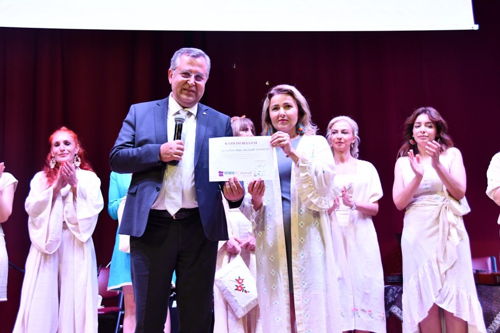 Fethiye Belediyesi Başkan Yardımcısı Güzide Özkaya ve belediye çalışanlarının gerçekleştirdiği defile katılımcılar tarafından tam not aldı. Alkışlar eşliğinde sahneye gelen Fethiye Likya Kadın Kooperatifi Başkanı Çiğdem Karaca, Yeşilüzümü Dastarı’nı dünyaya tanıtılması için büyük emek verdiklerinin altını çizdi. Çiğdem Karaca’ya başarı belgesini Fethiye Ticaret ve Sanayi Odası Başkanı Osman Çıralı takdim etti.