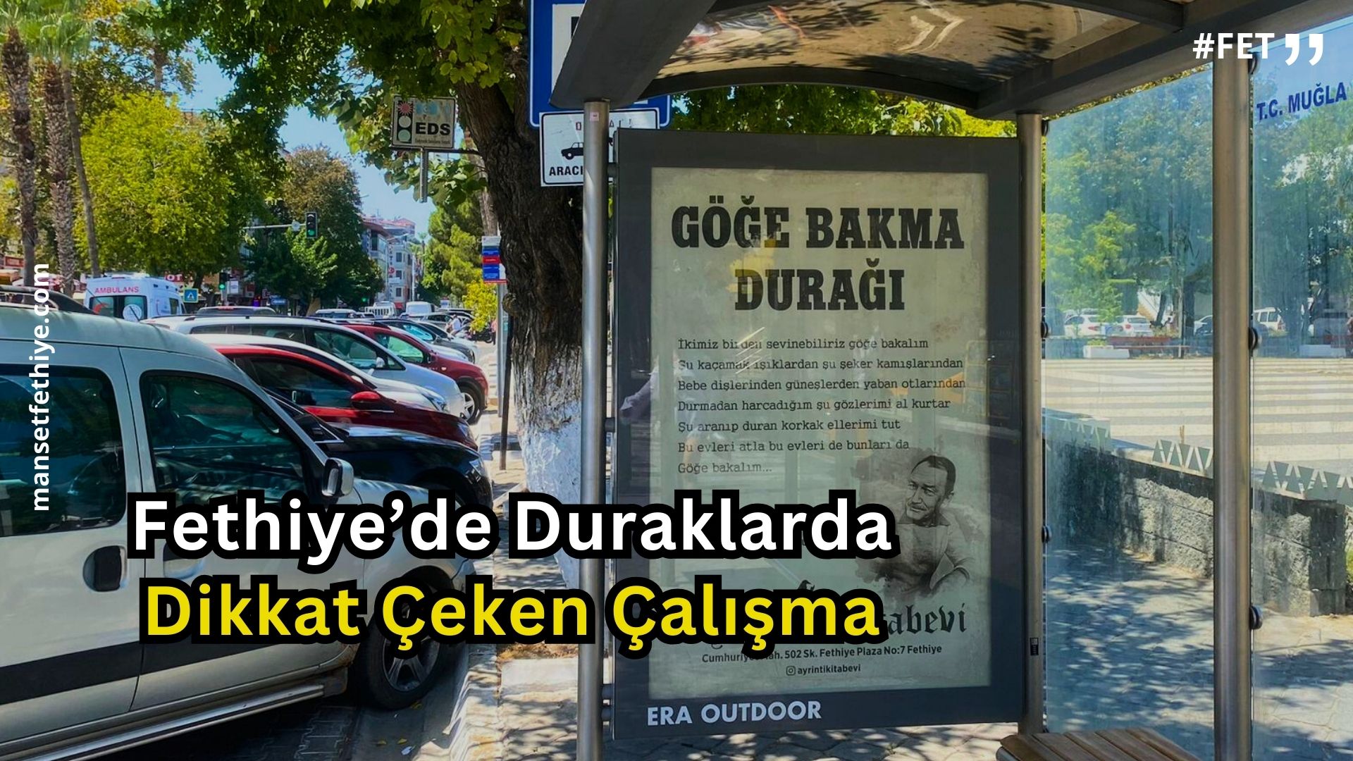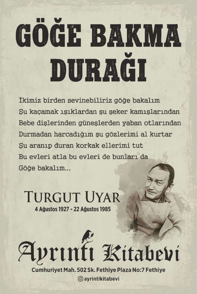 Fethiye’de faaliyet gösteren Ayrıntı Kitapevi, ünlü şair Turgut Uyar’ın ölüm yıldönümüne özel çalışma gerçekleştirerek dikkat çekti. Fethiye’de bulunan duraklara şairin ünlü şiiri ‘Göğe Bakma Durağı’na yer vererek andı. Fethiye’de vatandaşların dikkatini çeken bu çalışma büyük beğeni aldı.