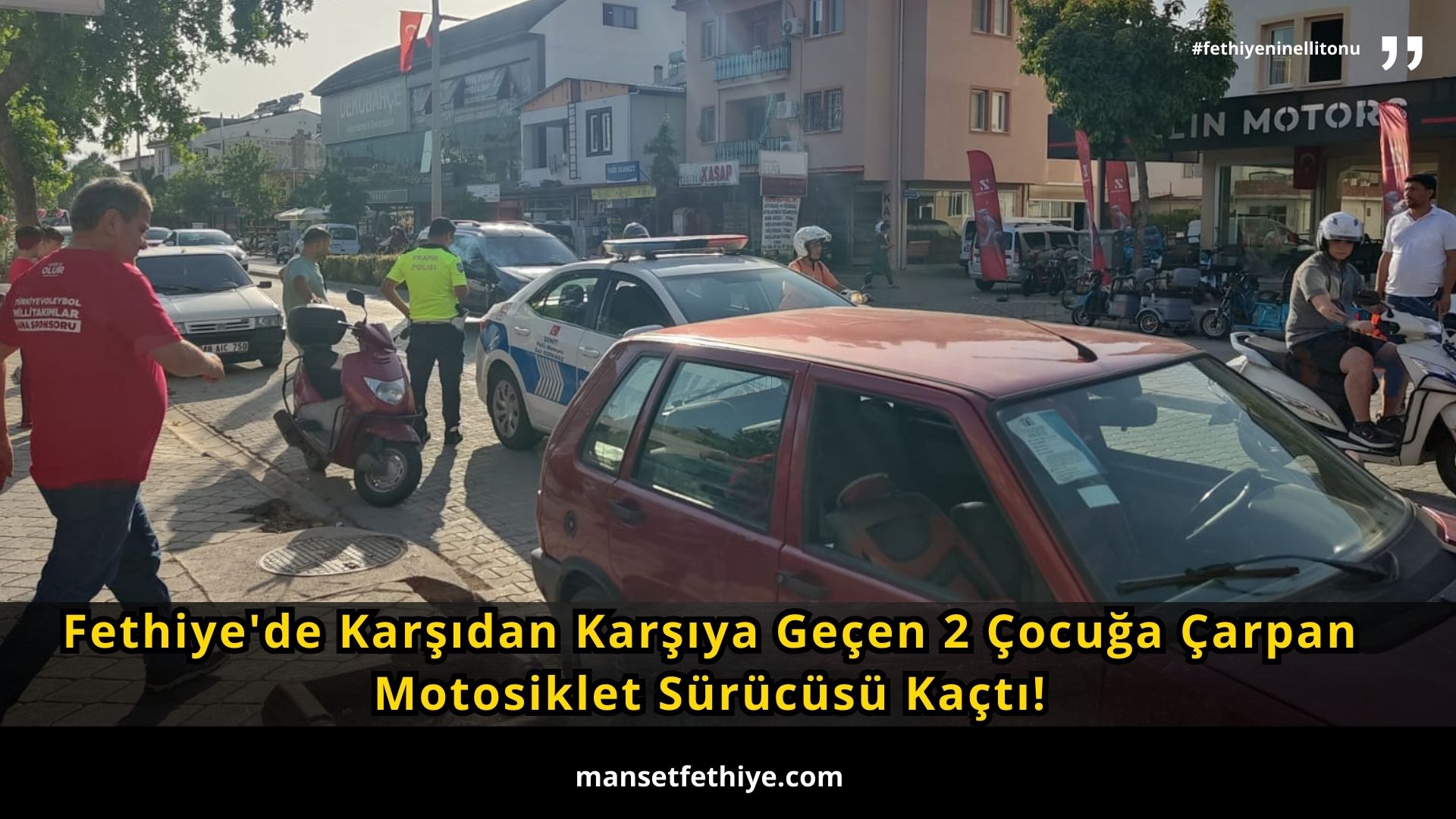 Olay saat 17.30 civarlarında Menteşoğlu Mahallesi, Süleyman Demirel Bulvarı üzerinde meydana geldi. Fethiye’den Çalıca istikametine gitmekte olan bir motosiklet karşıdan karşıya geçmekte olan 2 çocuğa çarptı ve kaçtı.