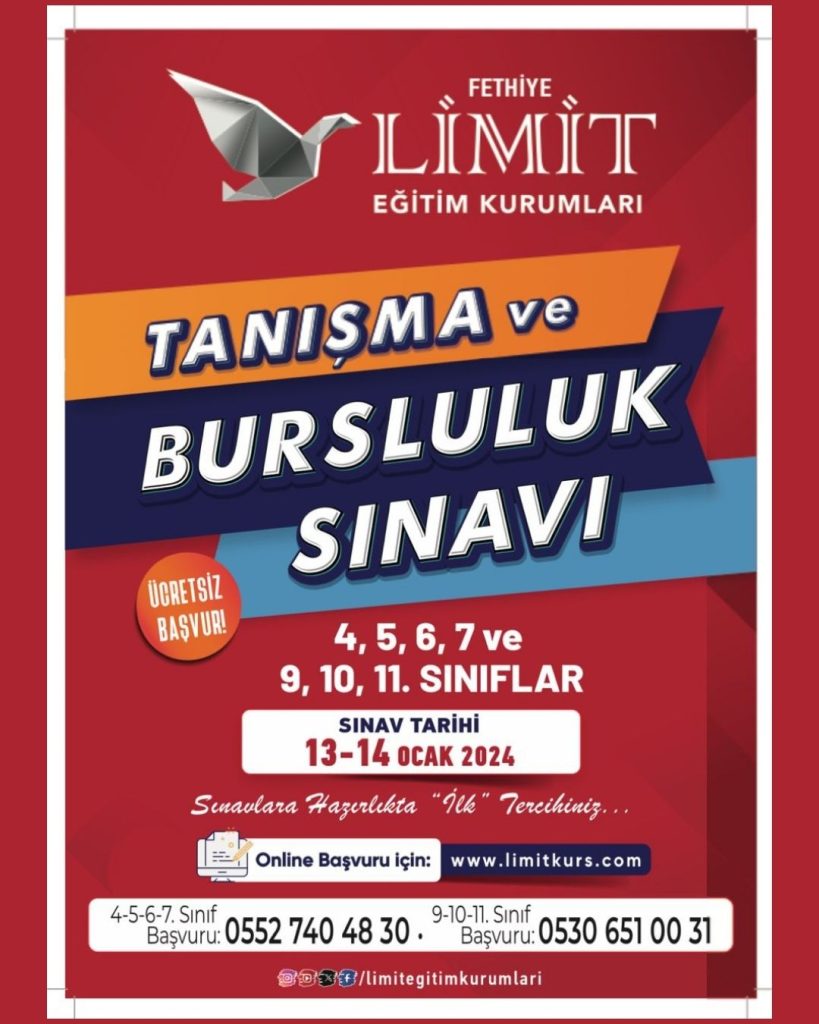 Fethiye Limit Eğitim Kurumları, 4-5-6-7 ve 9-10-11. sınıf öğrencilerine ilgilendiren bir duyuruda bulundu. Sosyal medya hesabı üzerinden gerçekleştirilen duyuruda “Tanışma ve Bursluluk” sınavının ücretsiz olacağı bilgisine yer verildi.