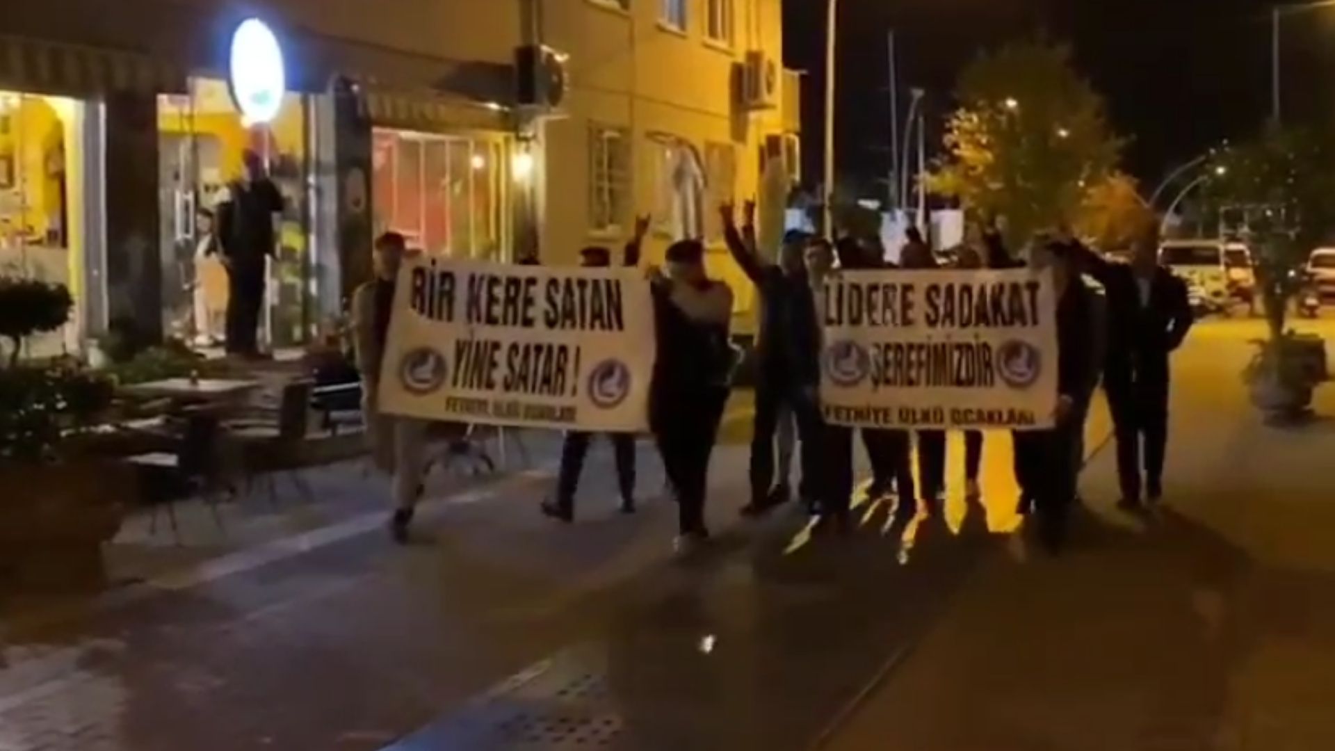 Zafer Partisi Genel Başkanı Ümit Özdağ’ın konaklayacağı otelin önünde “Bir kere satan, yine satar”, “Lidere sadakat, şerefimizdir”, yazılı pankartlar ve “Hareketin lideri Devlet Bahçeli” sloganları ile yürüdüler.