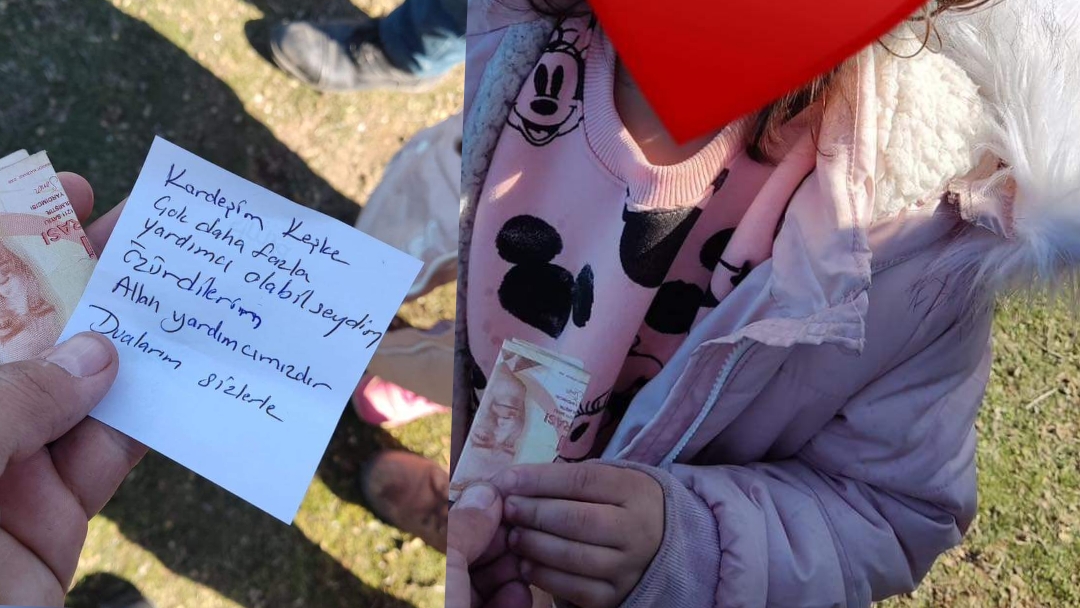 Muğla’nın Ortaca İlçesinde, Ortaca Belediyesi’nin yürüttüğü yardım çalışmalarında montun içinden 50 TL ve bir not çıktı. Notta yazan, KARDEŞİM KEŞKE ÇOK DAHA FAZLA YARDIMCI OLABİLSEYDİM, ÖZÜR DİLERİM ALLAH YARDIMCIMIZDIR, DUALARIM SİZLERLE.” sözleri herkesi duygulandırdı.