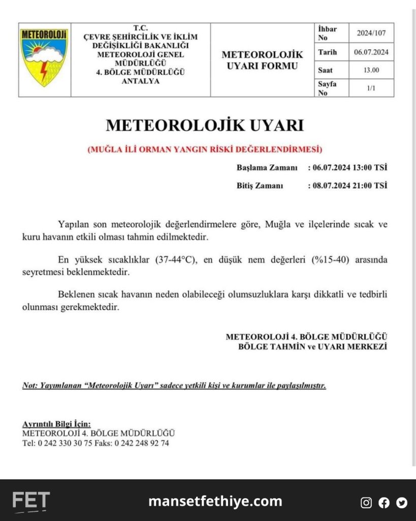 Meteoroloji 4. Bölge Müdürlüğü, Bölge Tahmin ve Uyarı Merkezi Muğla için uyarıda bulundu. 06.07.2024-08.07.2024 tarihleri arasında yüksek sıcak ve kuru hava nedeniyle oluşabilecek olumsuzluklara karşı dikkatli olunması noktasında uyarıda bulundu.