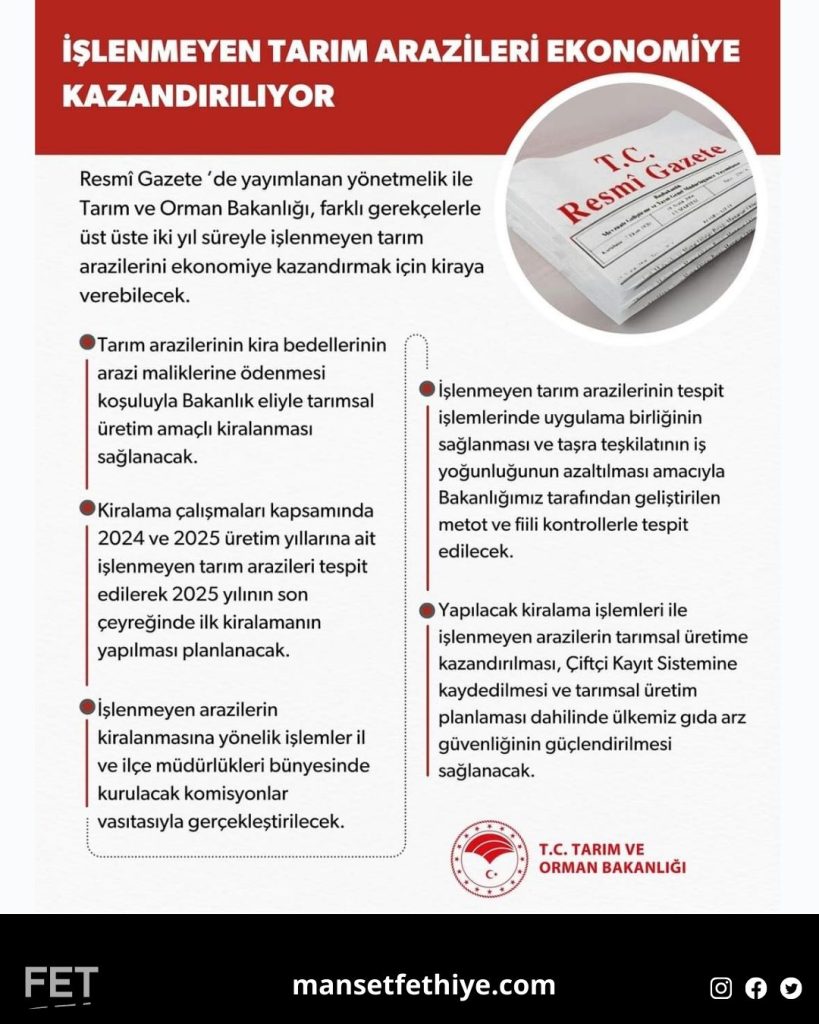 T.C. Resmi Gazete İşlenmeyen tarım arazilerinin tespit işlemlerinde uygulama birliğinin sağlanması ve taşra teşkilatının iş yoğunluğunun azaltılması amacıyla Bakanlığımız tarafından geliştirilen metot ve fiili kontrollerle tespit edilecek.