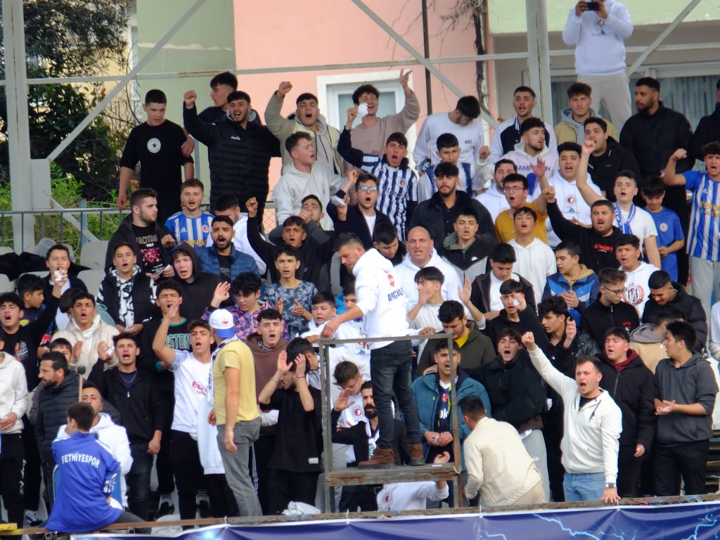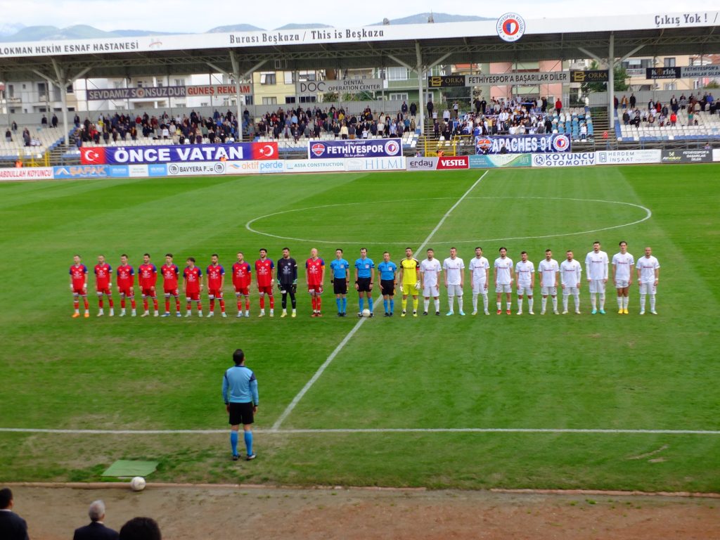 Fethiyespor taraftarları 90 dakika boyunca futbolculara destek verirken, Bursa’dan gelen az sayıda taraftarda maçı izledi.